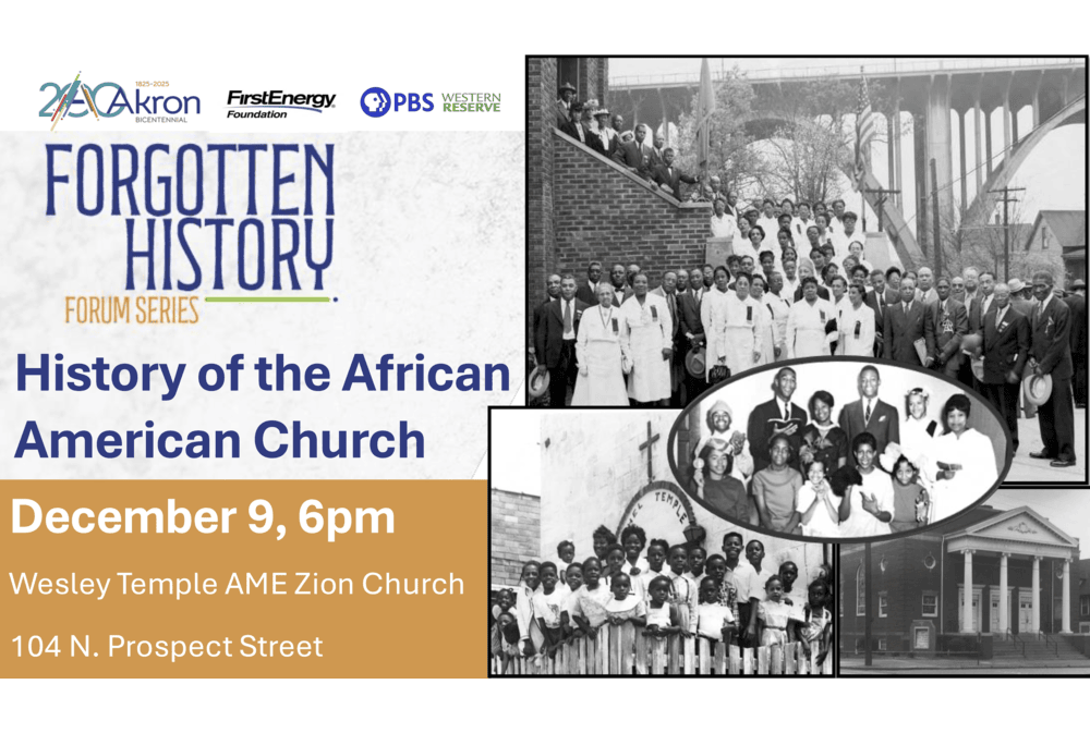 Join us for the next installment of the Forgotten History Forum Series presented by FirstEnergy Foundation, and in partnership with our exclusive media partner, PBS Western Reserve. Mark Greer, Executive Director of Akron200, moderates a discussion of the history of the African American Church. Free admission, click HERE to register now!
